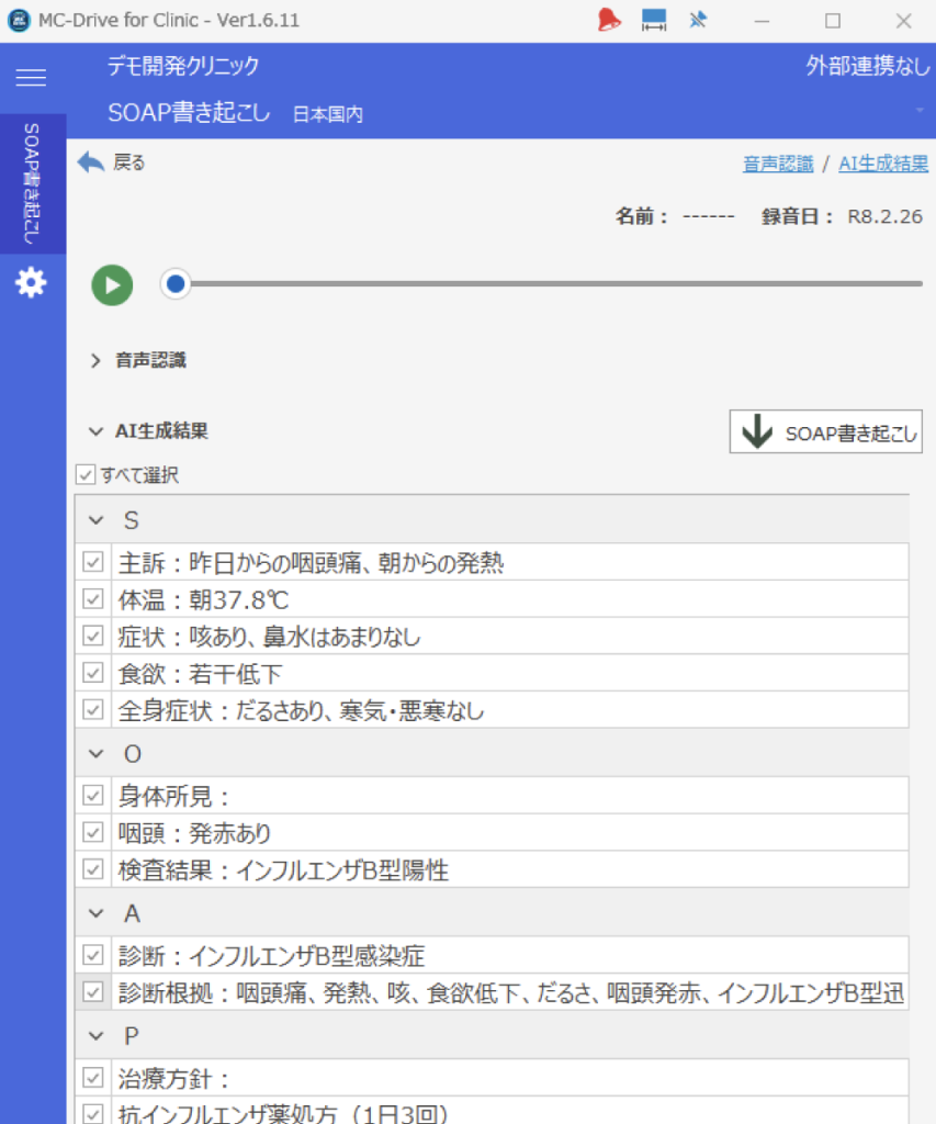 患者さんとの会話を録音した音声データが、テキストに変換されます。